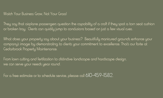 Main Office: 2 La France Way. Glen Mills, PA 19342. 610-459-1582 | Serving the Pennsylvania & Delaware Regions Copyright © 2014 Cedarbrook Property maintenance Inc. All rights reserved. Website developed by Starblaze Enterprises
